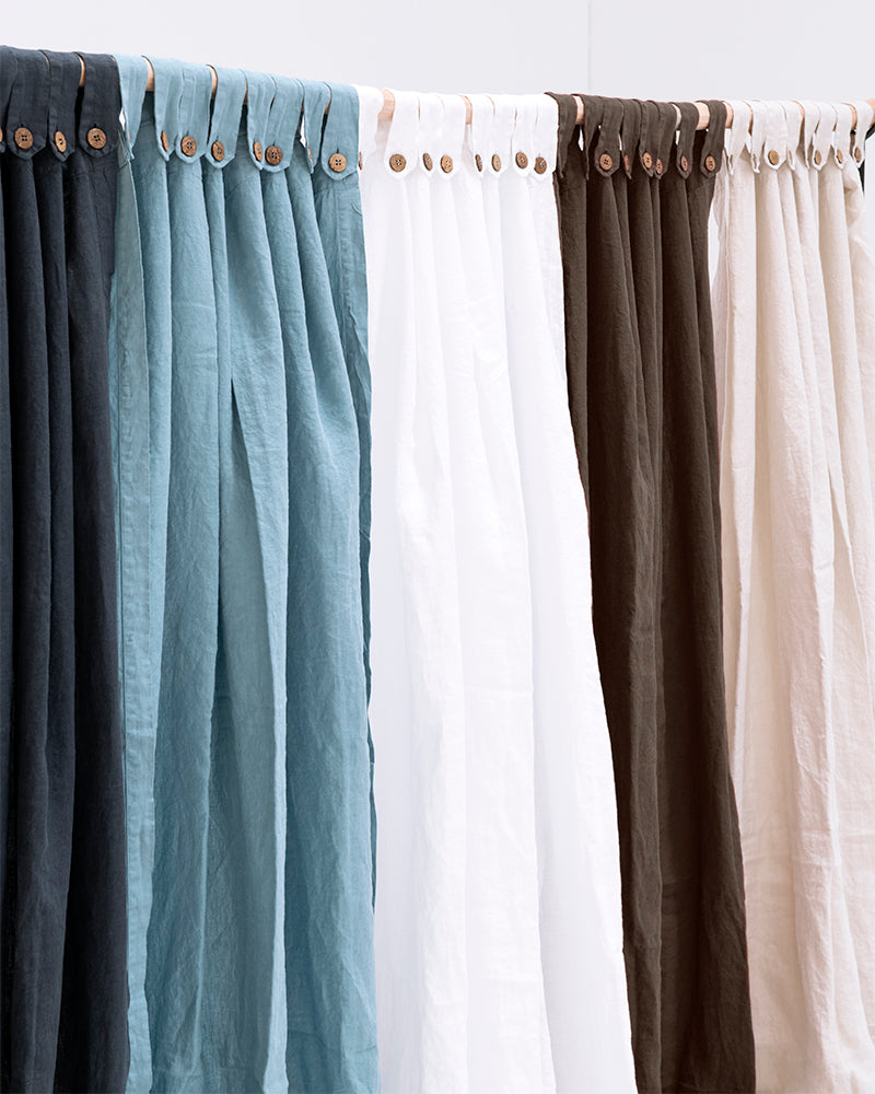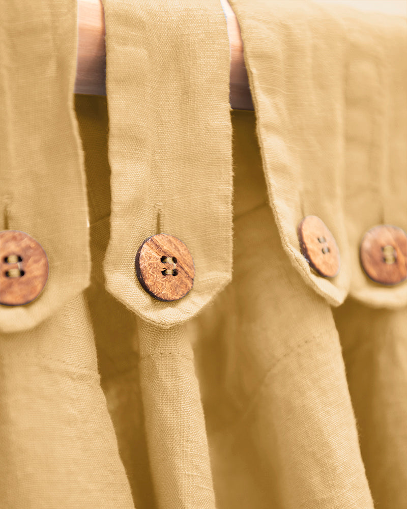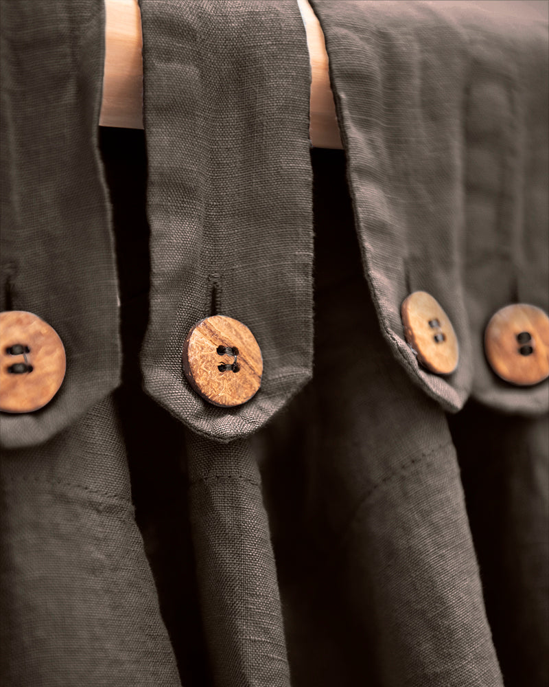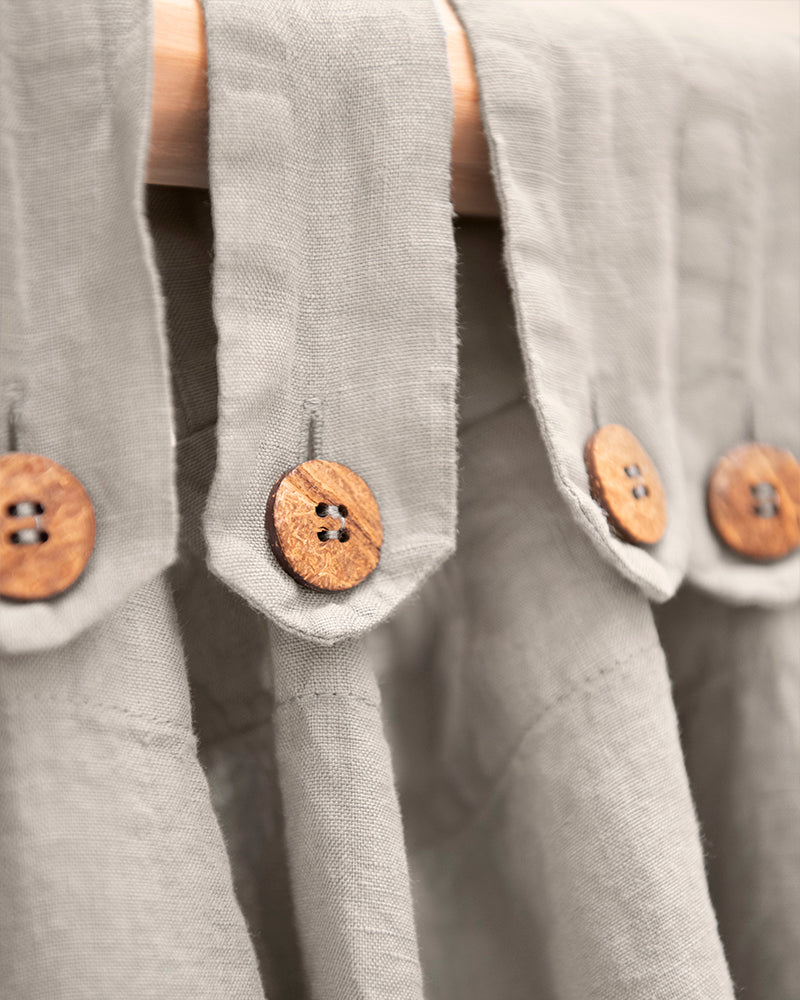 Descripció: Cortina de lli de 185 gr/m2 i caiguda espectacular, amb travetes acabades amb botons de coco delicats.