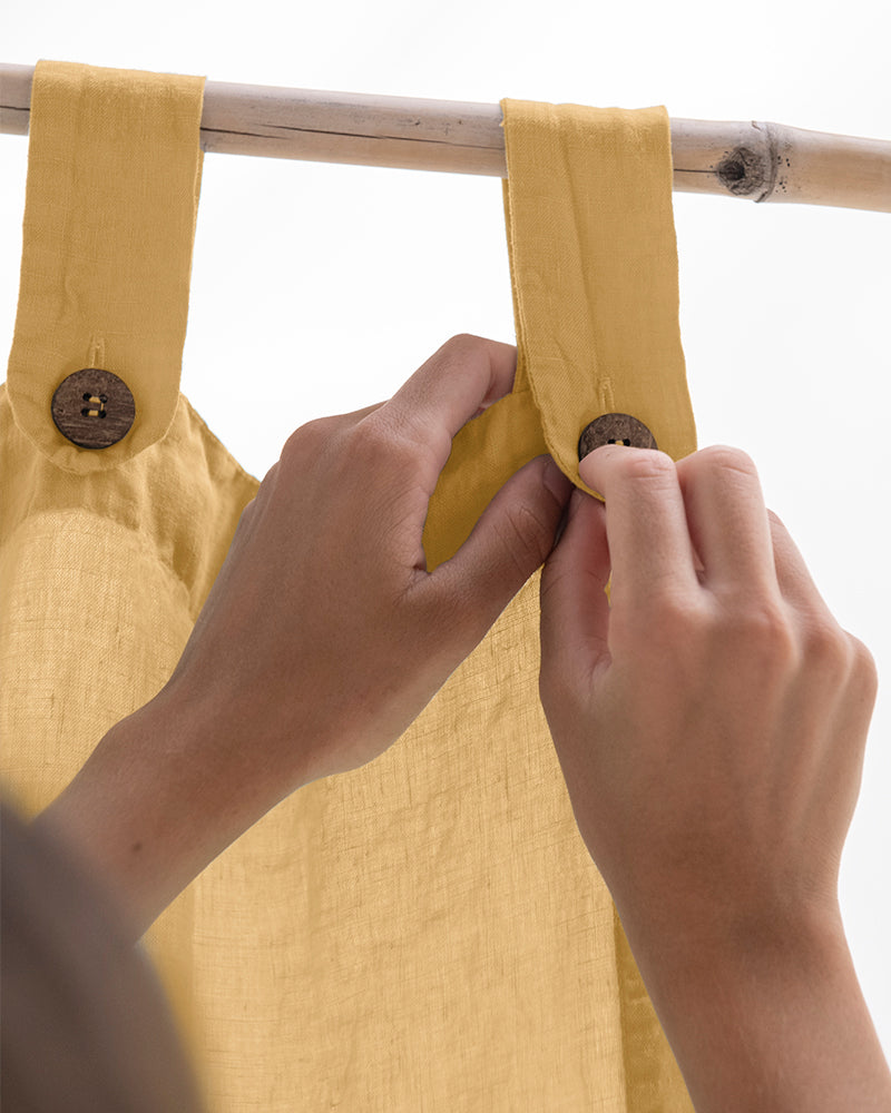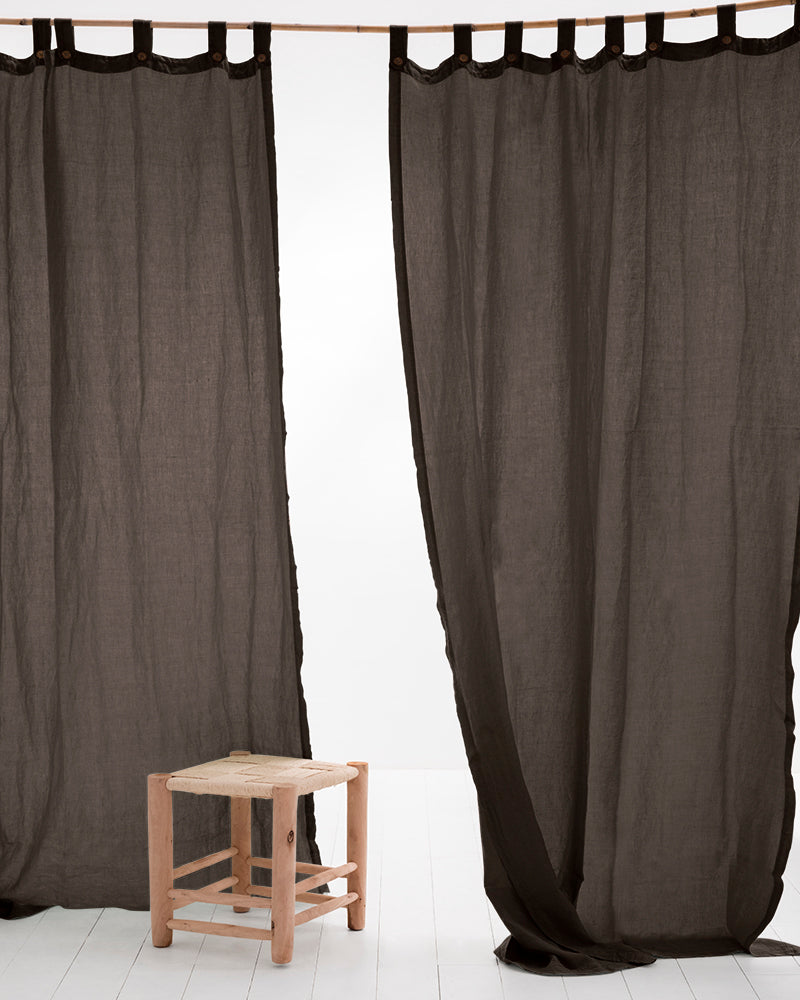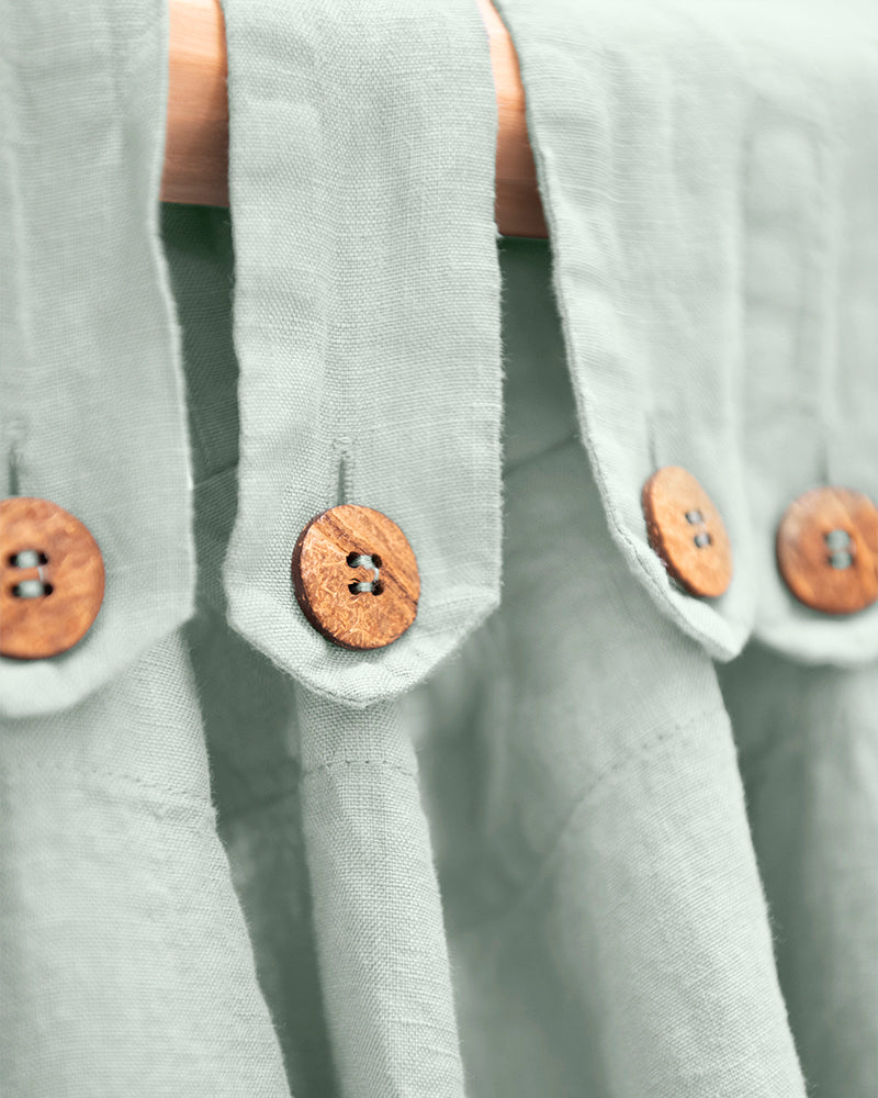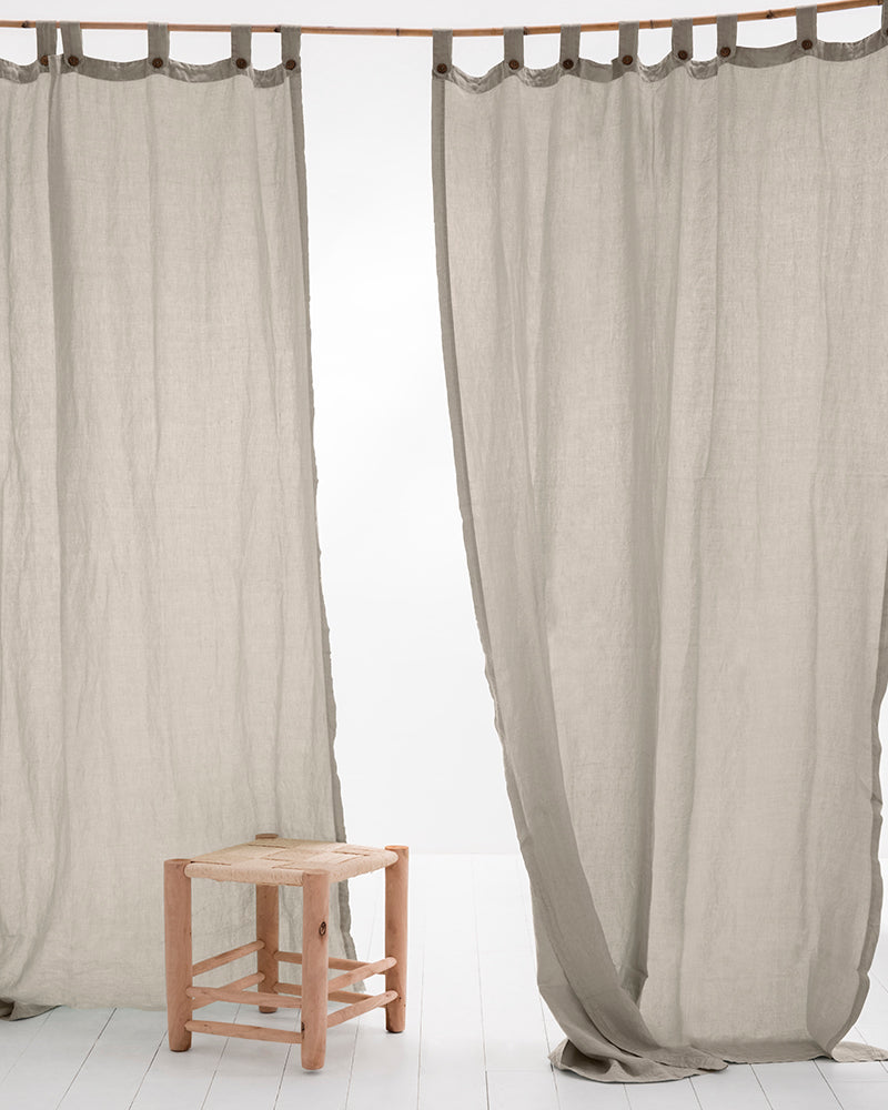 Descripció: Cortina de lli de 185 gr/m2 i caiguda espectacular, amb travetes acabades amb botons de coco delicats.