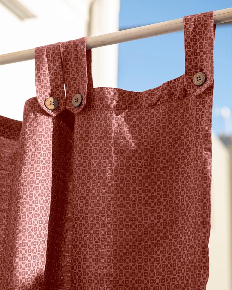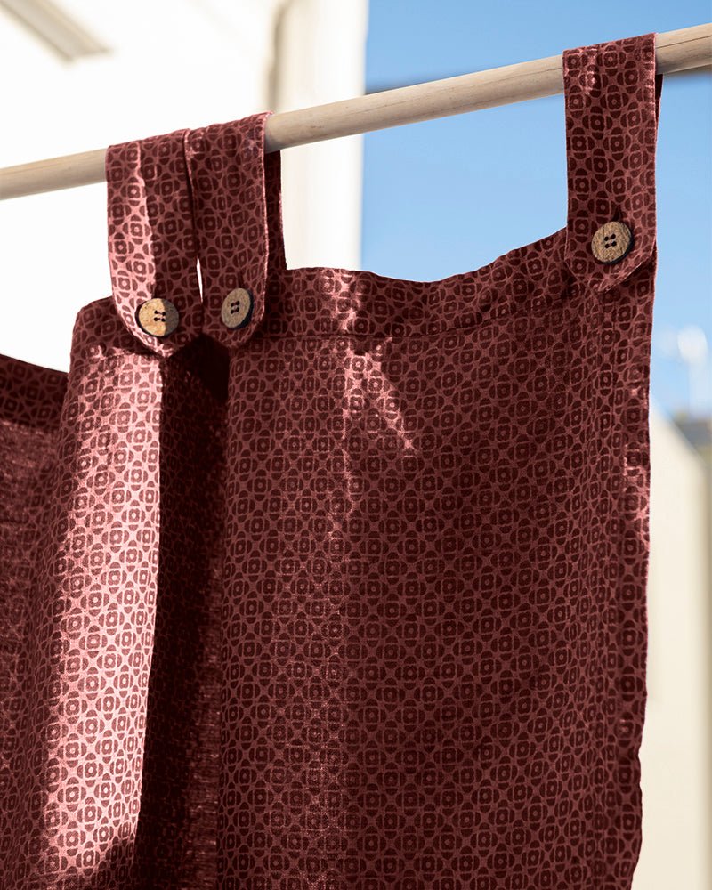 Description: 155 gr/m2 linen curtain with spectacular drape, with loops finished with delicate coconut buttons.