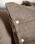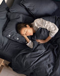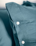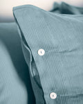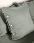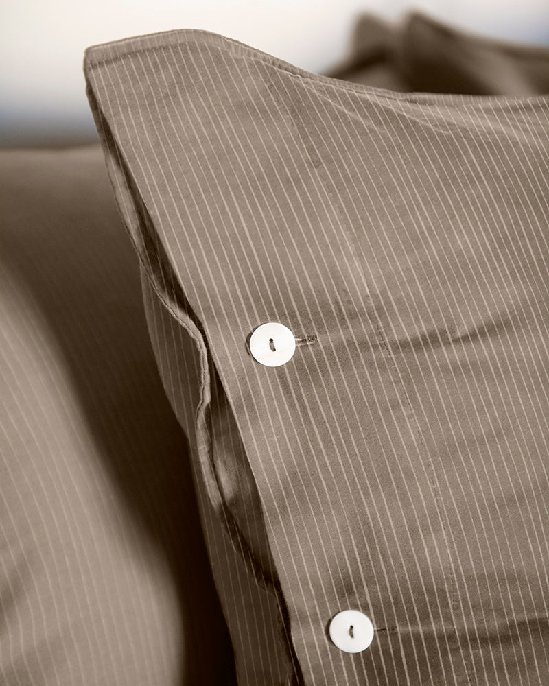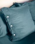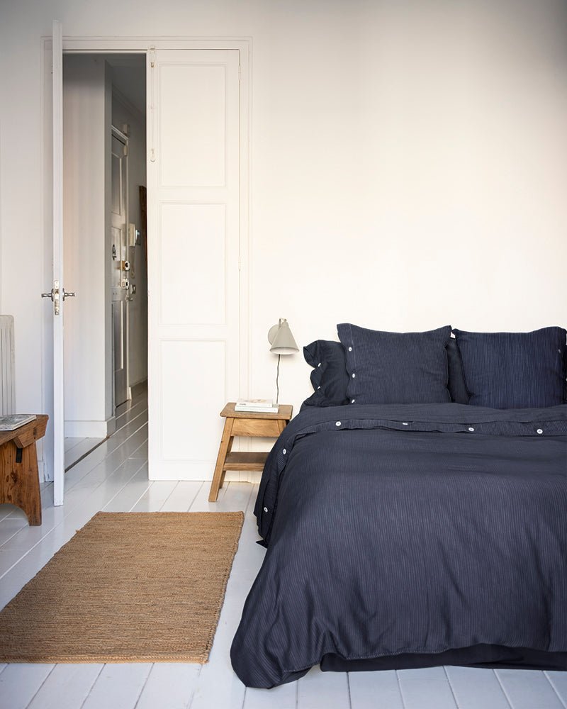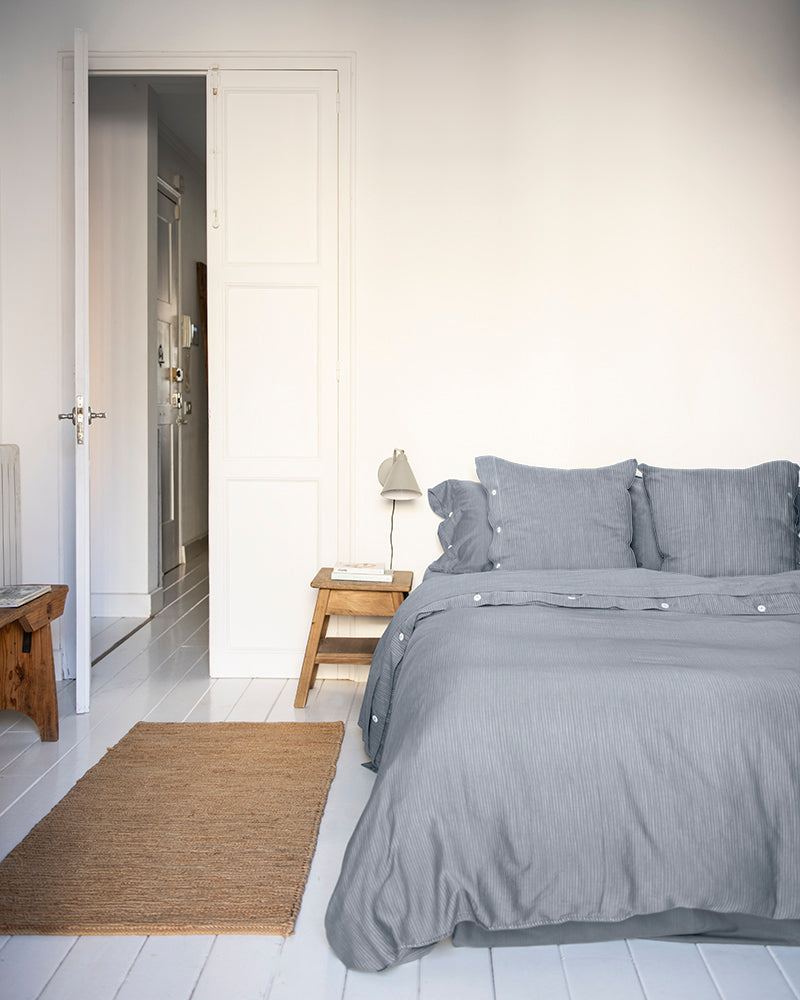 Description: Duvet cover, cushions and pillows with flap and button closure. Possibility of placing the buttons at the foot of the bed or in the middle.