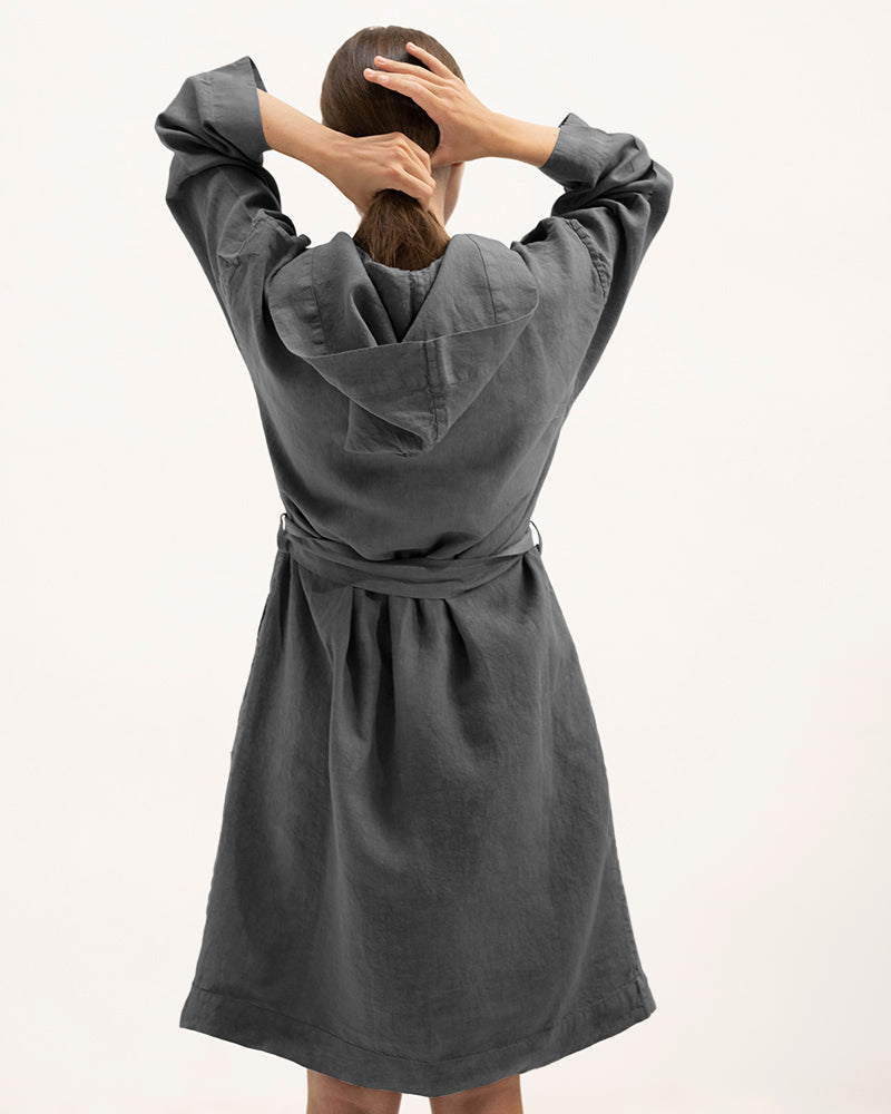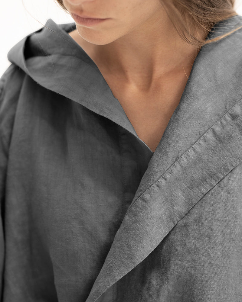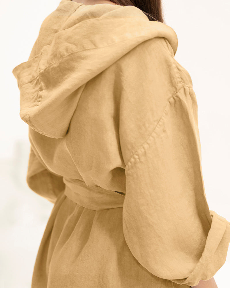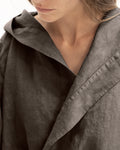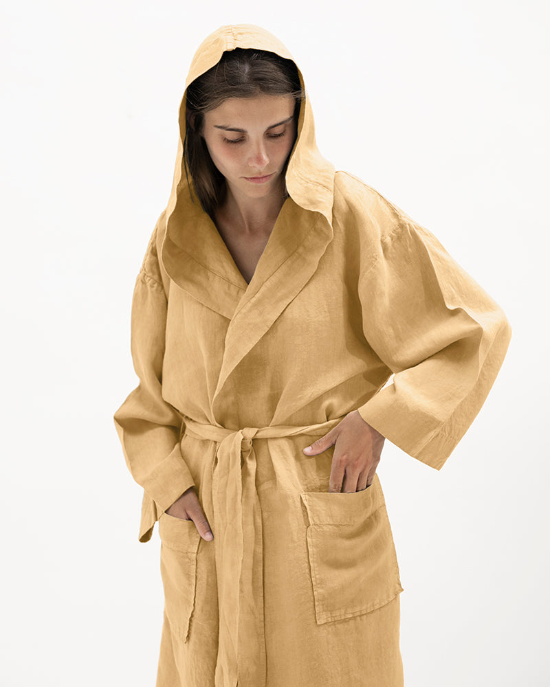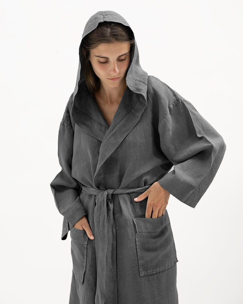 Description: Linen kimono robe with a hood, long sleeves and an adjustable belt.