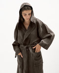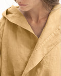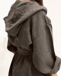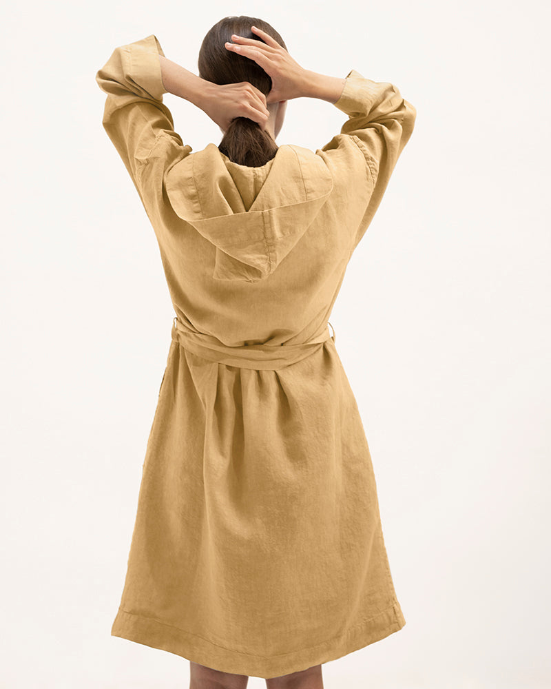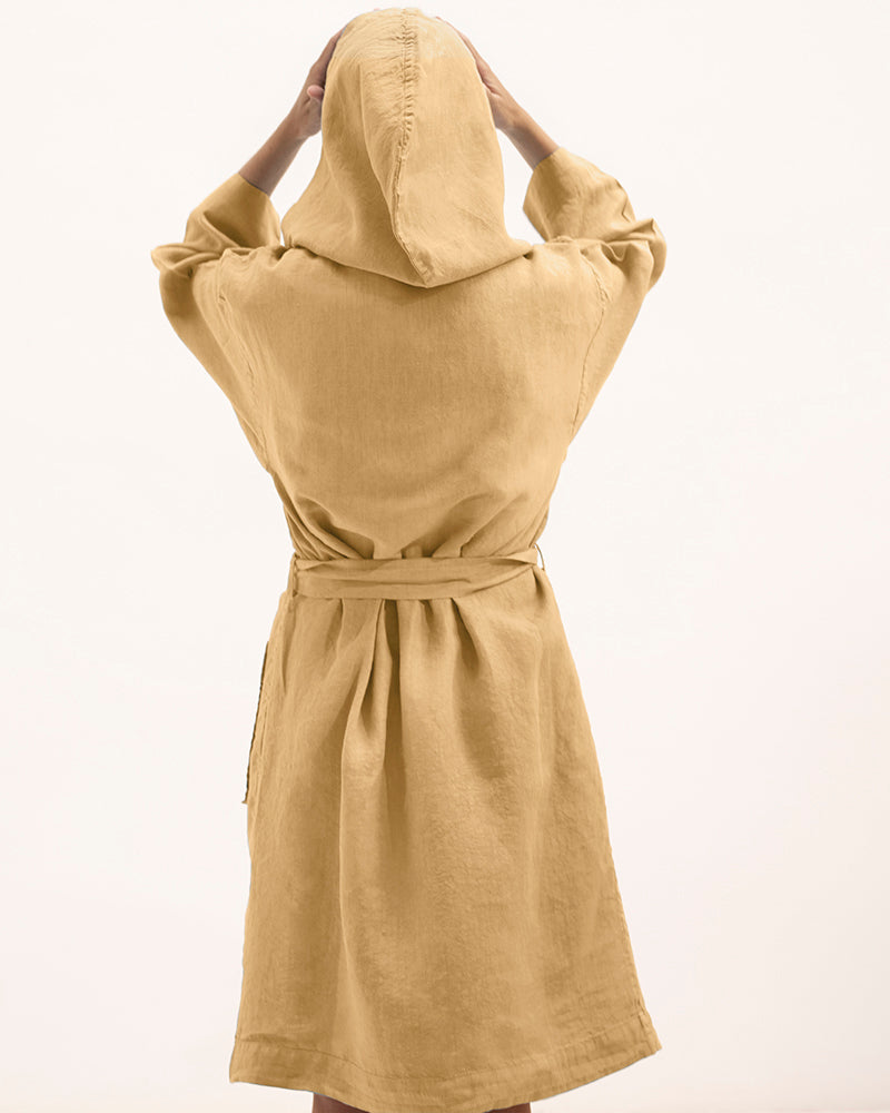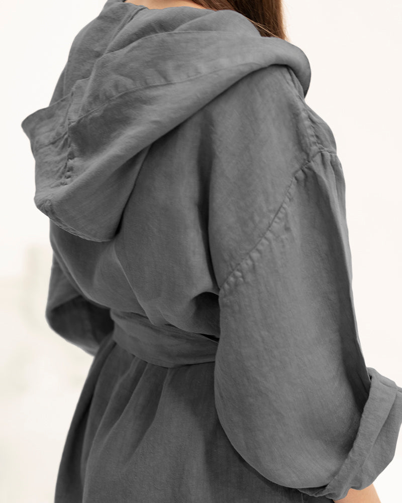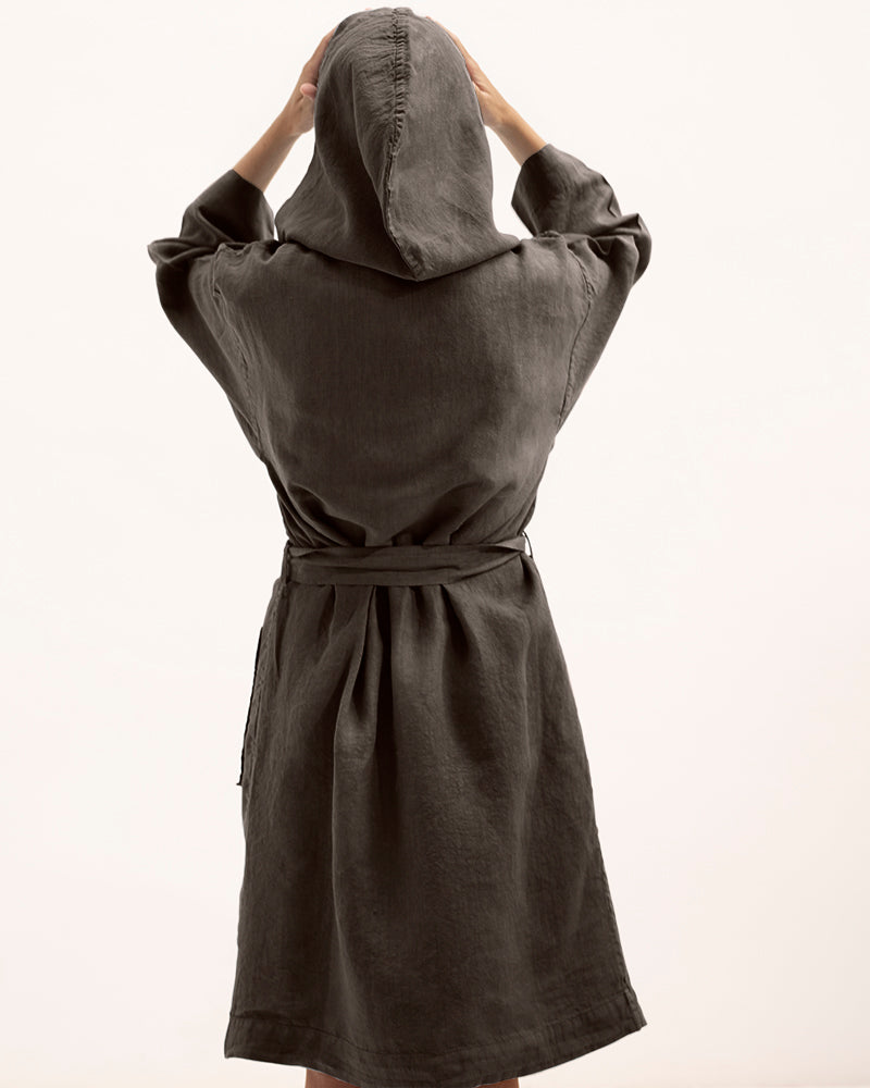 Description: Linen kimono robe with a hood, long sleeves and an adjustable belt.