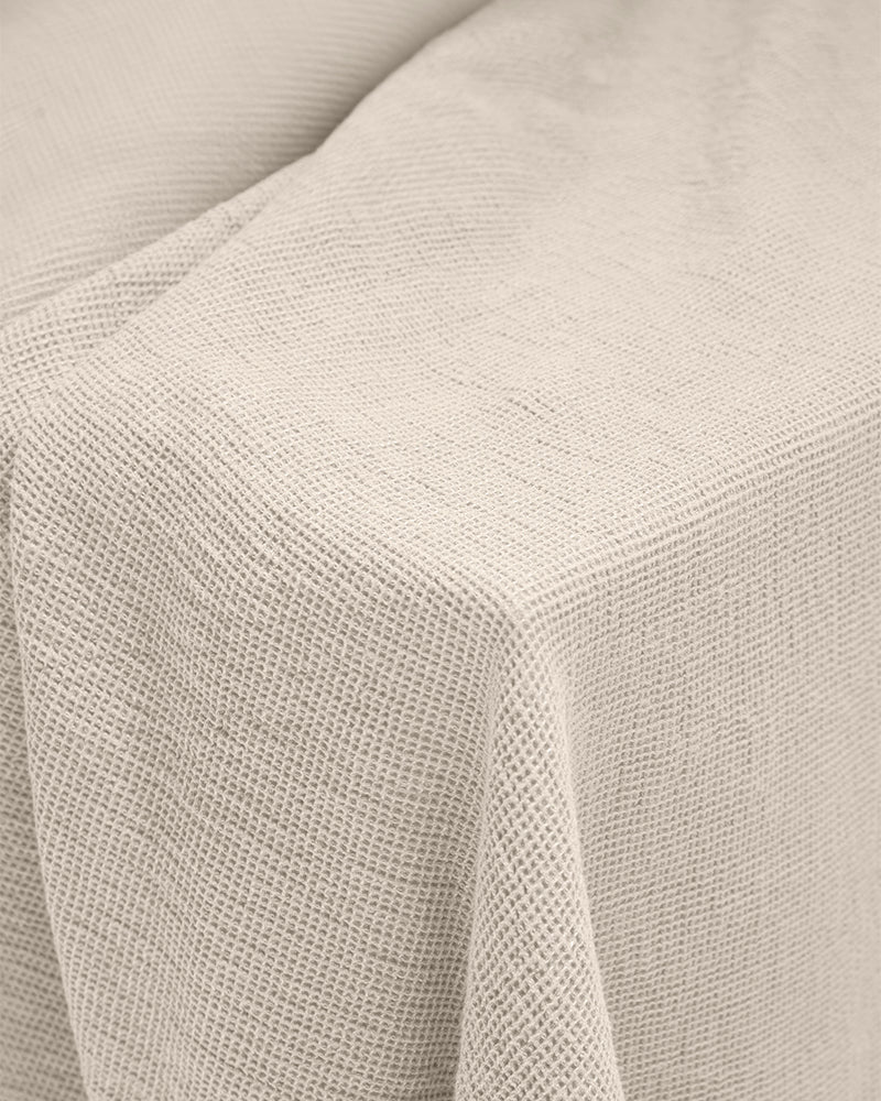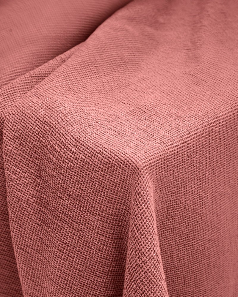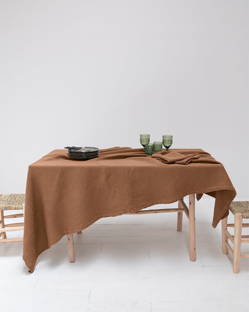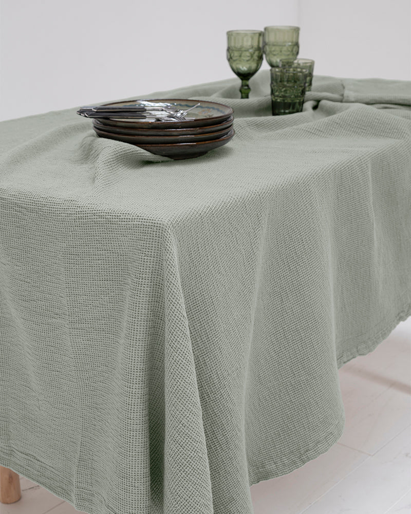 Solid Color Garment Dyed and Washed: Our organic cotton waffle tablecloth has been garment dyed and washed, providing a soft texture and unique look. Every touch is an experience of authenticity and warmth.