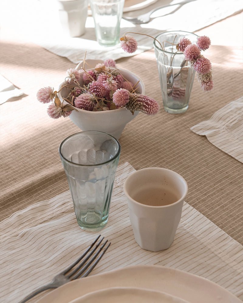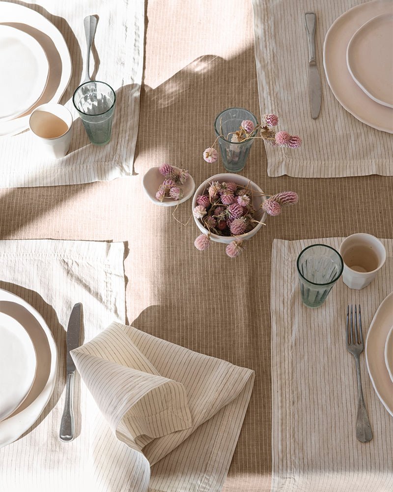 The Marta table set features linen/organic cotton tablecloths, linen napkins and two-packs of individual tablecloths. The tablecloths are available in different universal sizes, designed to fit all types of tables. When making your choice, keep in mind that the product is washed and will not shrink, it will always remain elegant.