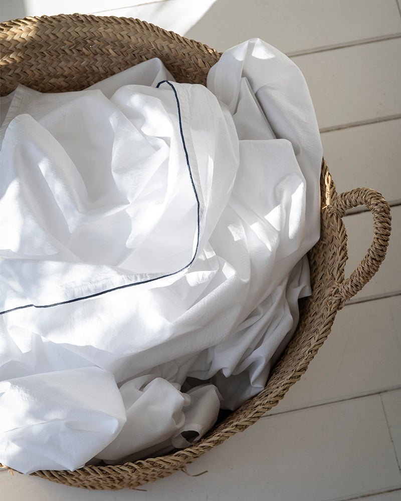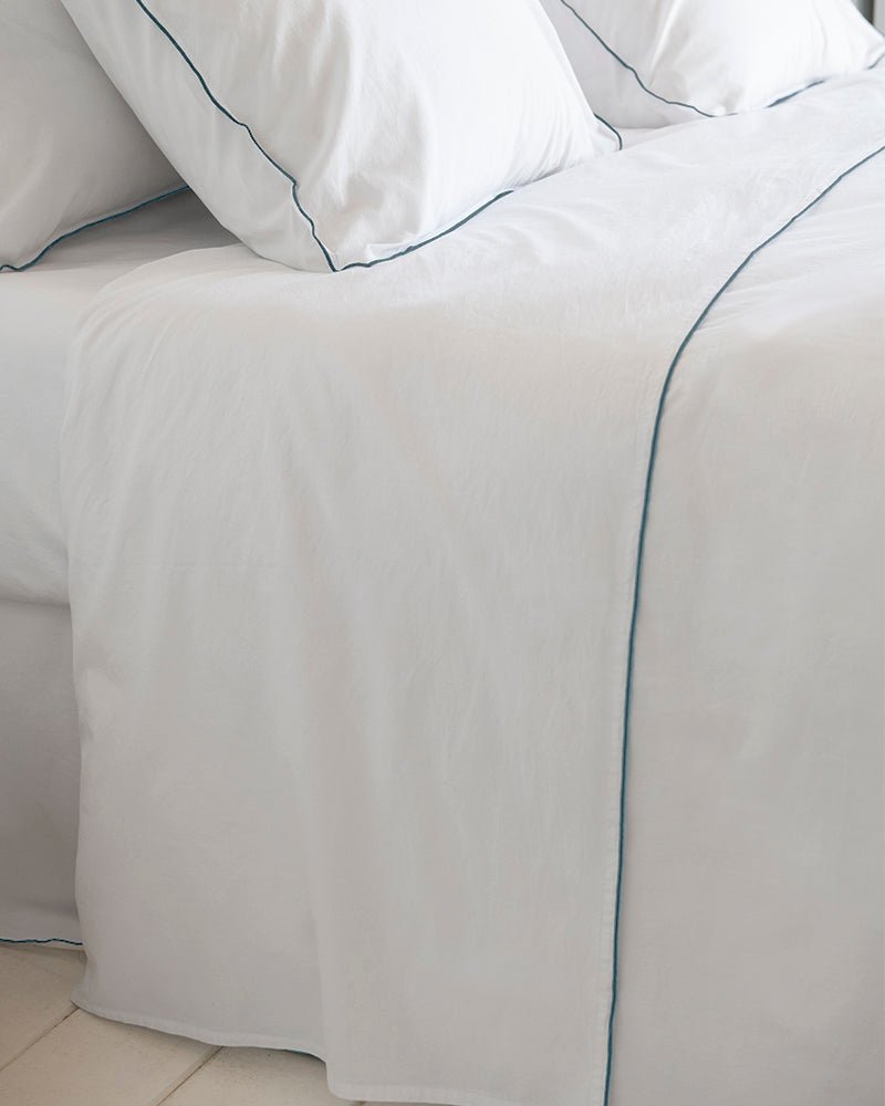 Finish: 100% lyocell percale white washed with colored scallop, made in Portugal.