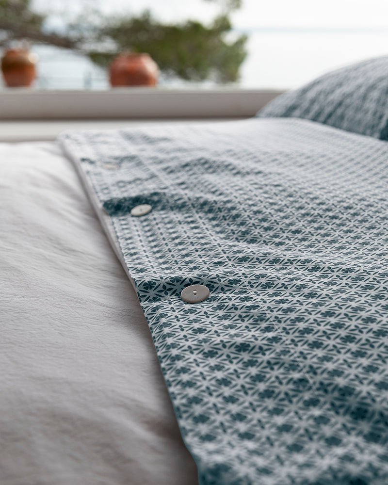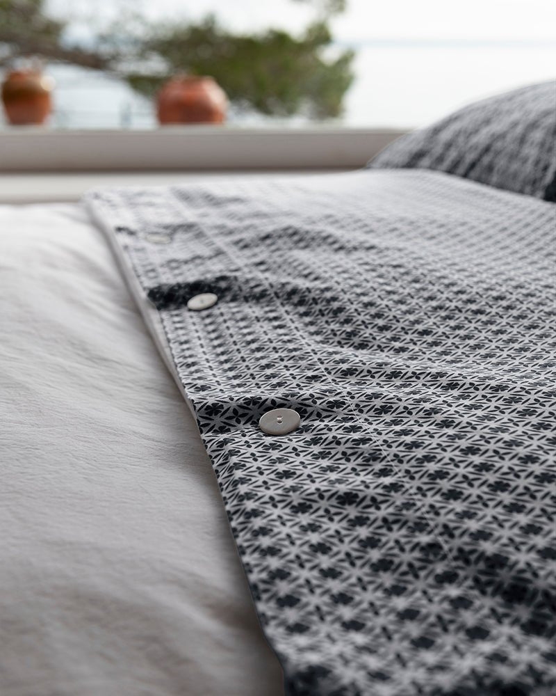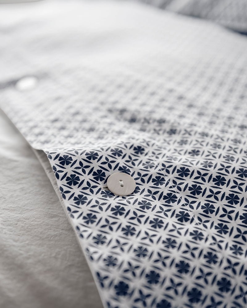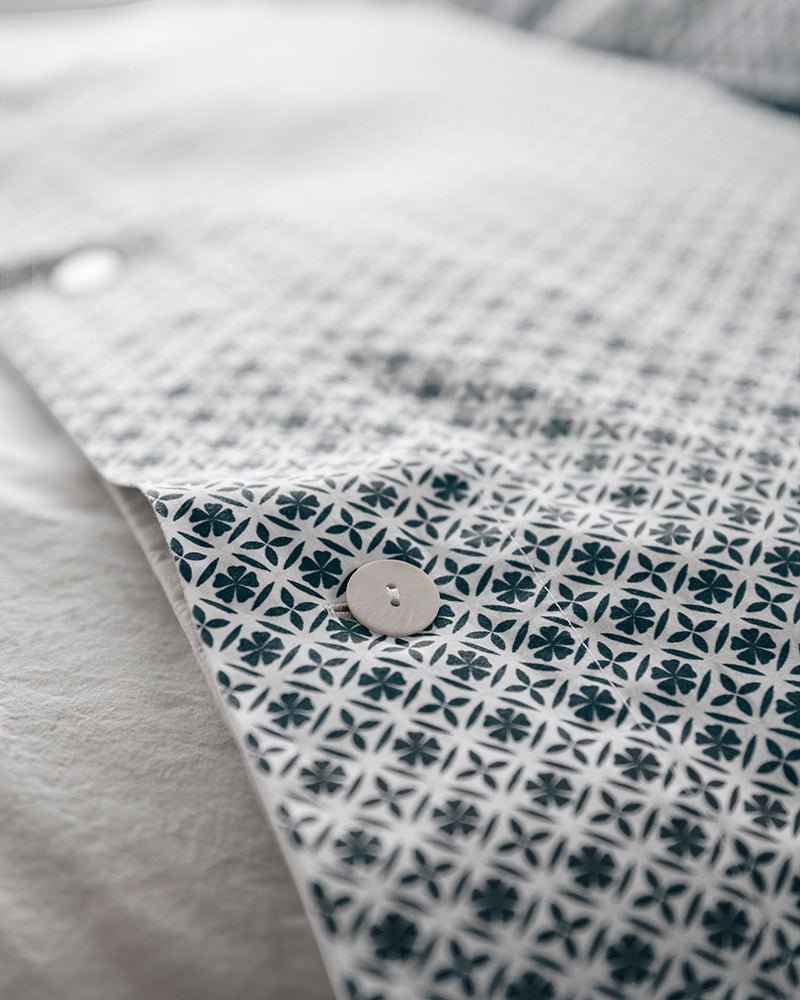 Description : Housse de couette, coussins et oreillers avec rabat et fermeture à boutons. Pour la housse de couette, les boutons peuvent être placés au pied du lit ou au centre.
